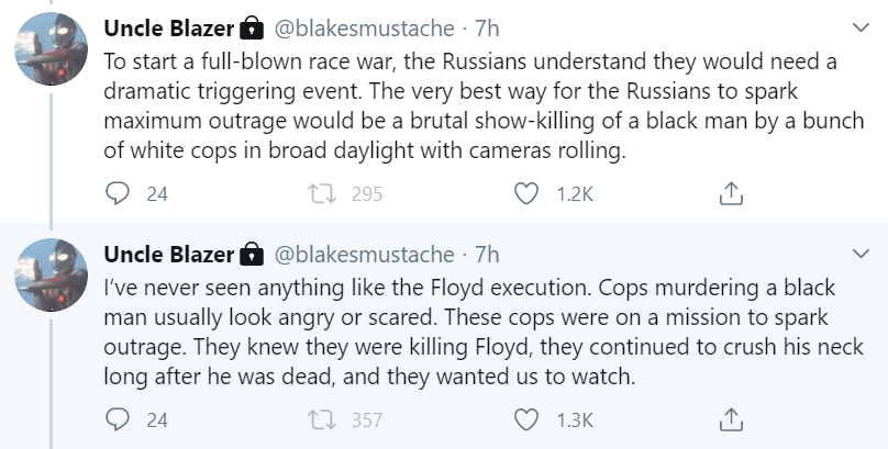 The account is locked now but they followed up by explaining a Russian agent infiltrated the police department and brainwashed police officers (I kid you not) to stage the Floyd murder in front of cameras. His evidence was that the cops didn't express the appropriate emotion.