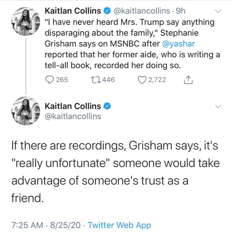 @kaitlancollins. Stephanie Winston Wolkoff’s book quotes Melania Trump making disparaging remarks about the Trump family and some of those comments were taped. Read my story here in my newsletter: https://bit.ly/2Qn5Lbx pic.twitter.com/O2IjVYzGmH