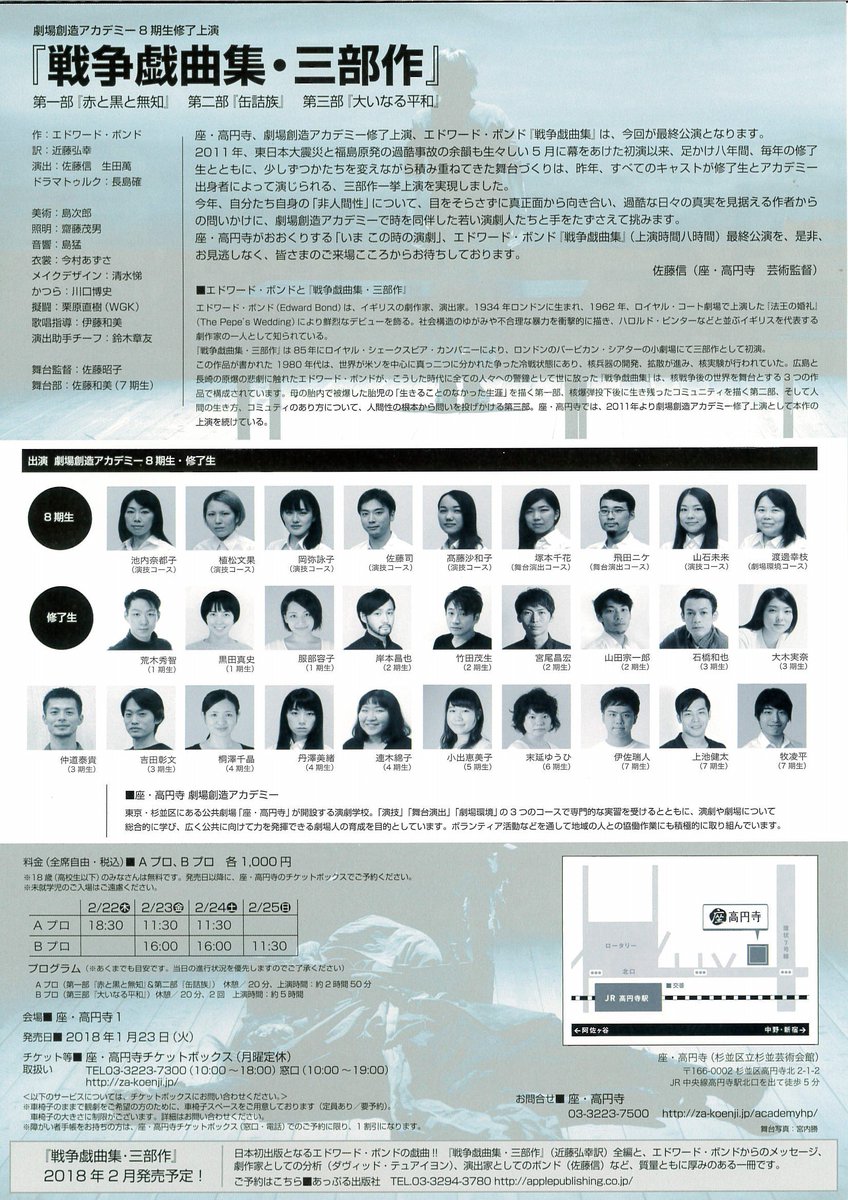 座・高円寺、劇場創造アカデミー修了上演、エドワード・ボンド『戦争戯曲集』は、今回が最終公演となります。pic.twitter.com/W20GmcR8QK