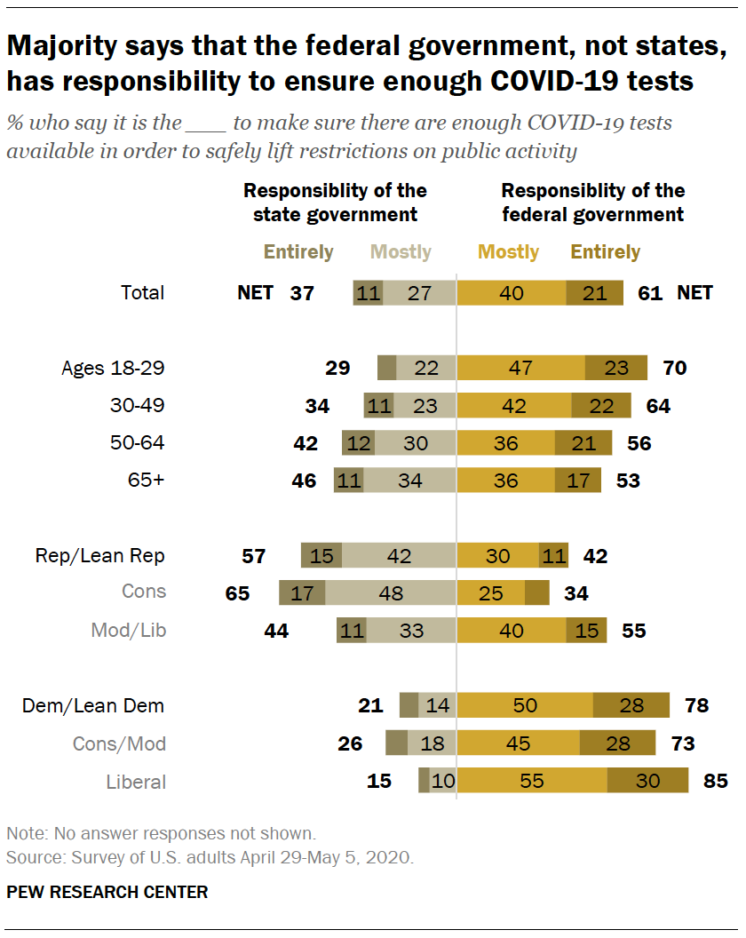 A majority of Americans (61%) say the federal government is mostly (40%) or entirely (21%) responsible in making sure there are enough COVID-19 tests available to the public. 37% say this responsibility falls on the state government. https://pewrsr.ch/3cpOUhK pic.twitter.com/rwVnQUE95d