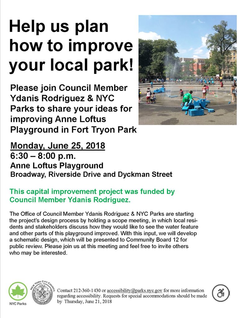ADVISORY: Today, June 25 at 6:30pm, @NYCCouncil Member Ydanis Rodriguez will join @NYCParks, & others for the first scoping meeting to get ideas for improving Anne Loftus Playground at the Fort Tryon Park in Northern Manhattan. #AnneLoftusPlayground #FortTryonParkpic.twitter.com/dLyZZ1kv7u