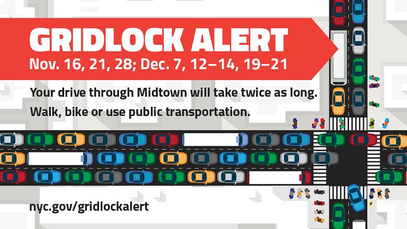 NYers! #GRIDLOCKALERT- Find alternatives to commuting on Wed. 12/19 - Fri. 12/21. Make sure you plan ahead and utilize #NYCMassTransit options when traveling in #MidtownManhattan.https://twitter.com/NYC_DOT/status/1074777738991624197 …