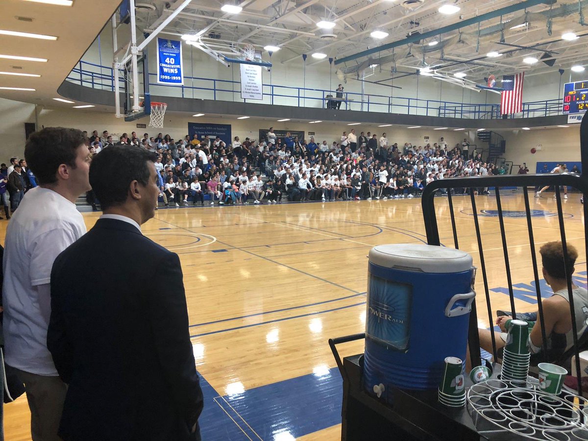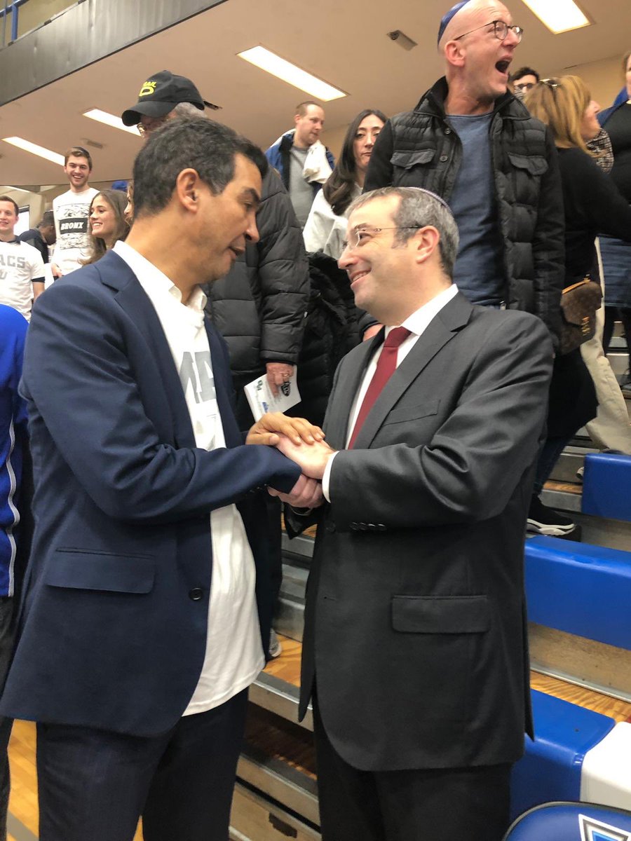 El Presidente de Yeshiva University Dr. Rabbi Ari Berman conversa con el concejal Ydanis Rodriguez en medio del torneo del Skyline Conference 2019 Men’s Basketball Championship Semifinal en Amsterdam y la calle 185. El final de hoy Ow vs Maccabees @YUathletics #VIVAMACCABEESpic.twitter.com/VtWZmORIUM