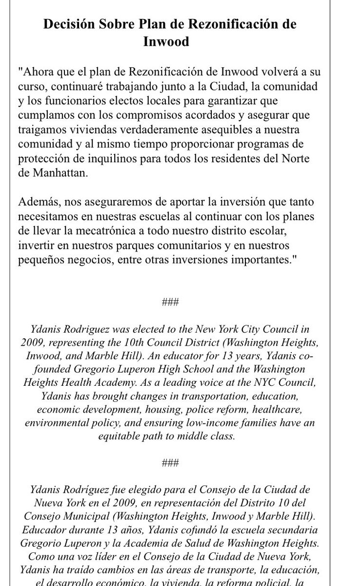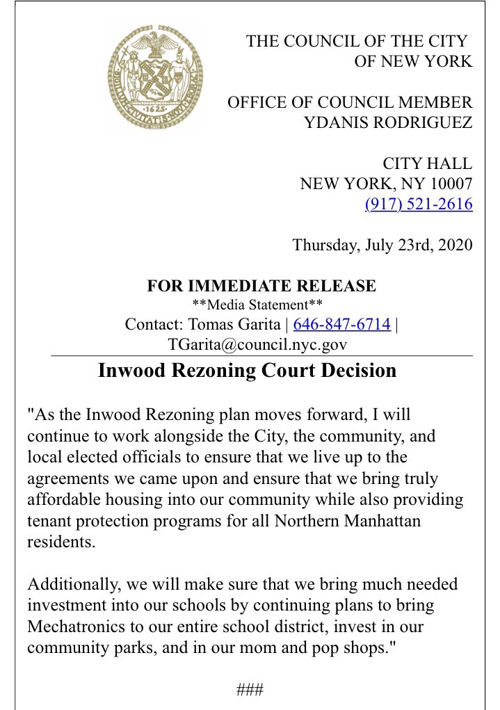 My statement on the Inwood Rezoning Court decision. Mi declaración en la decisión sobre el plan de Rezonificación de Inwoodpic.twitter.com/3UnGiWshcu