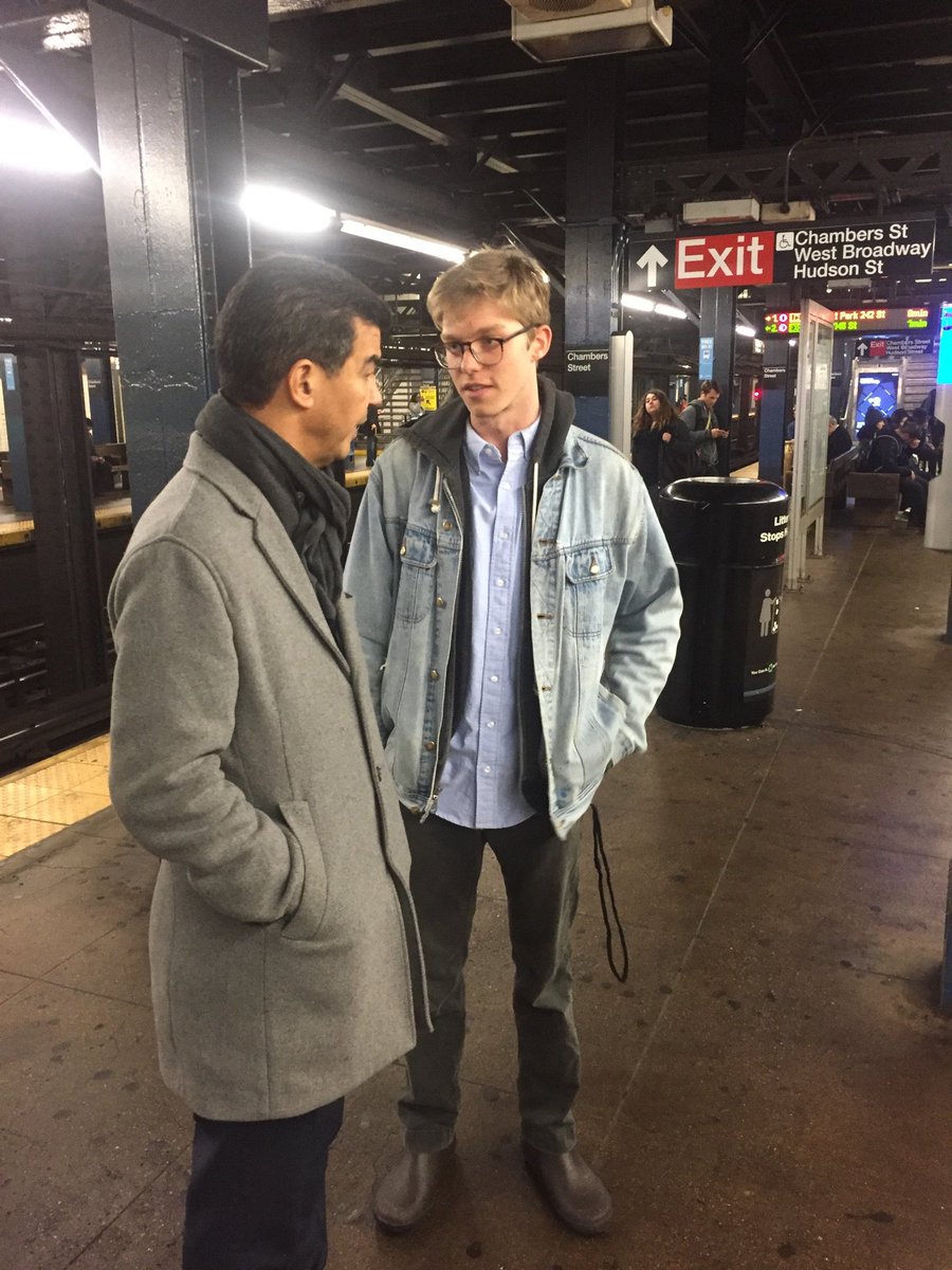 On the way to protest appointment of Andy Puzder as Labor Sec w/ @32BJSEIU, chatting with my intern Elias from NYU about career goals.pic.twitter.com/cu9QsZy1Iq