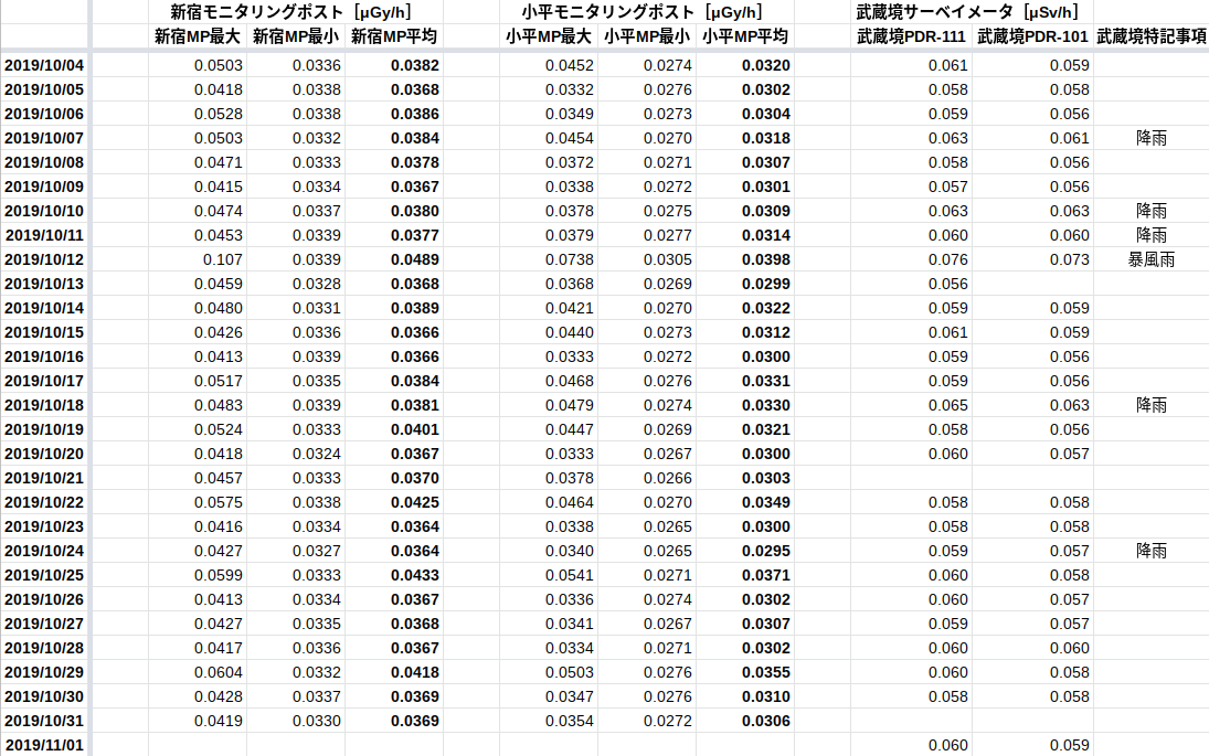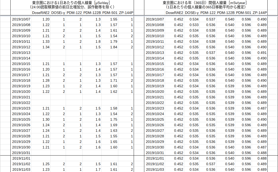普段公開している個人線量は東京圏外を訪れた際のデータを除外しています。 10月31日〜11月1日、福島県郡山市、伊達市、福島市を訪れた際の1日あたりの個人線量は表(画像下方の赤数字)の通りです。pic.twitter.com/mTgfGdqrlN