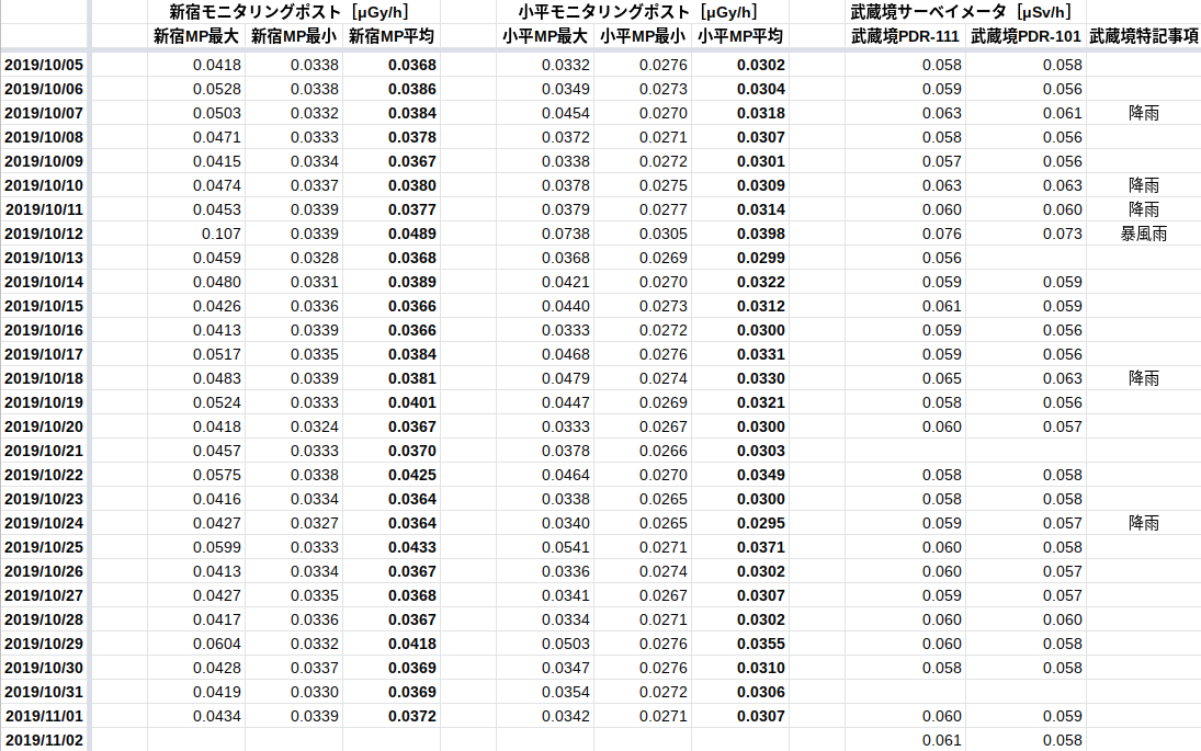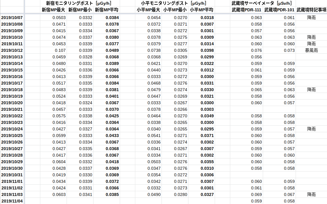 東京都武蔵野市境4丁目の放射線量 【空間線量】 新宿・小平モニタリングポストと都立武蔵高校正門(アスファルト路面1m高)サーベイメータの比較 https://docs.google.com/spreadsheets/d/12Civa1oIrAuNmdc8ojnMaBggE1m4iS4wWzq5oPK0RMs/edit?usp=sharing …pic.twitter.com/fPBRbMVIvk