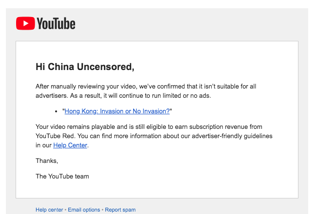 Every. Damn. Episode. YouTube will not monetize our #HongKong videos. Please explain why @TeamYouTubepic.twitter.com/MuUi0iTiWx
