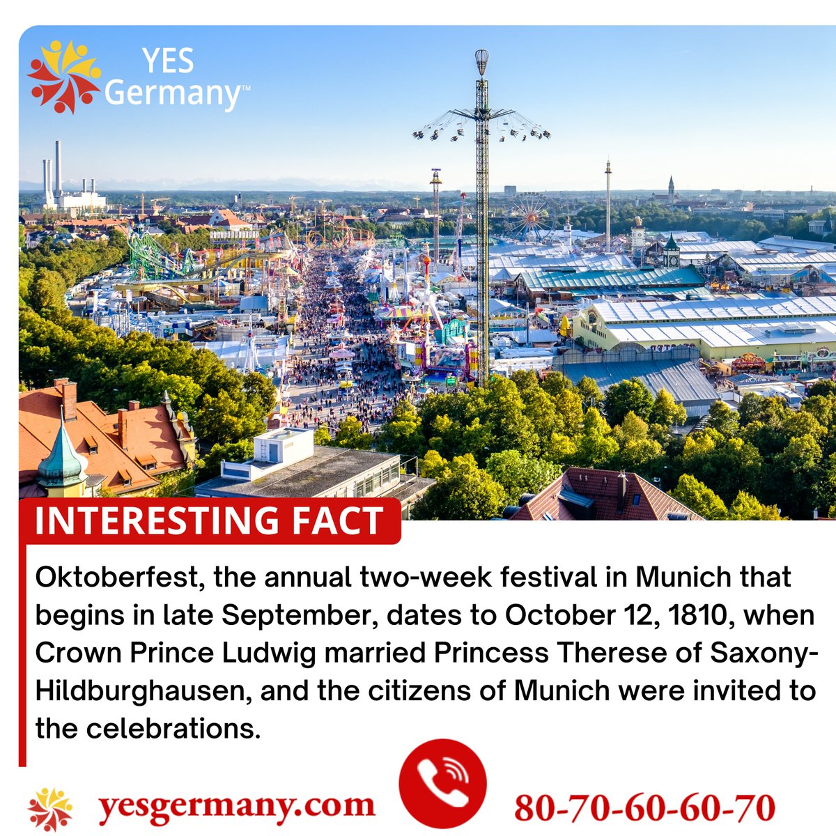 Oktoberfast, the annual two-week festival in Munich that begins in late September, dates to October 12, 1810, when Crown Price Ludwig married Princess Therese of Saxony-Hildburghausen, and the citizens of Munich were invited to the celebrations.