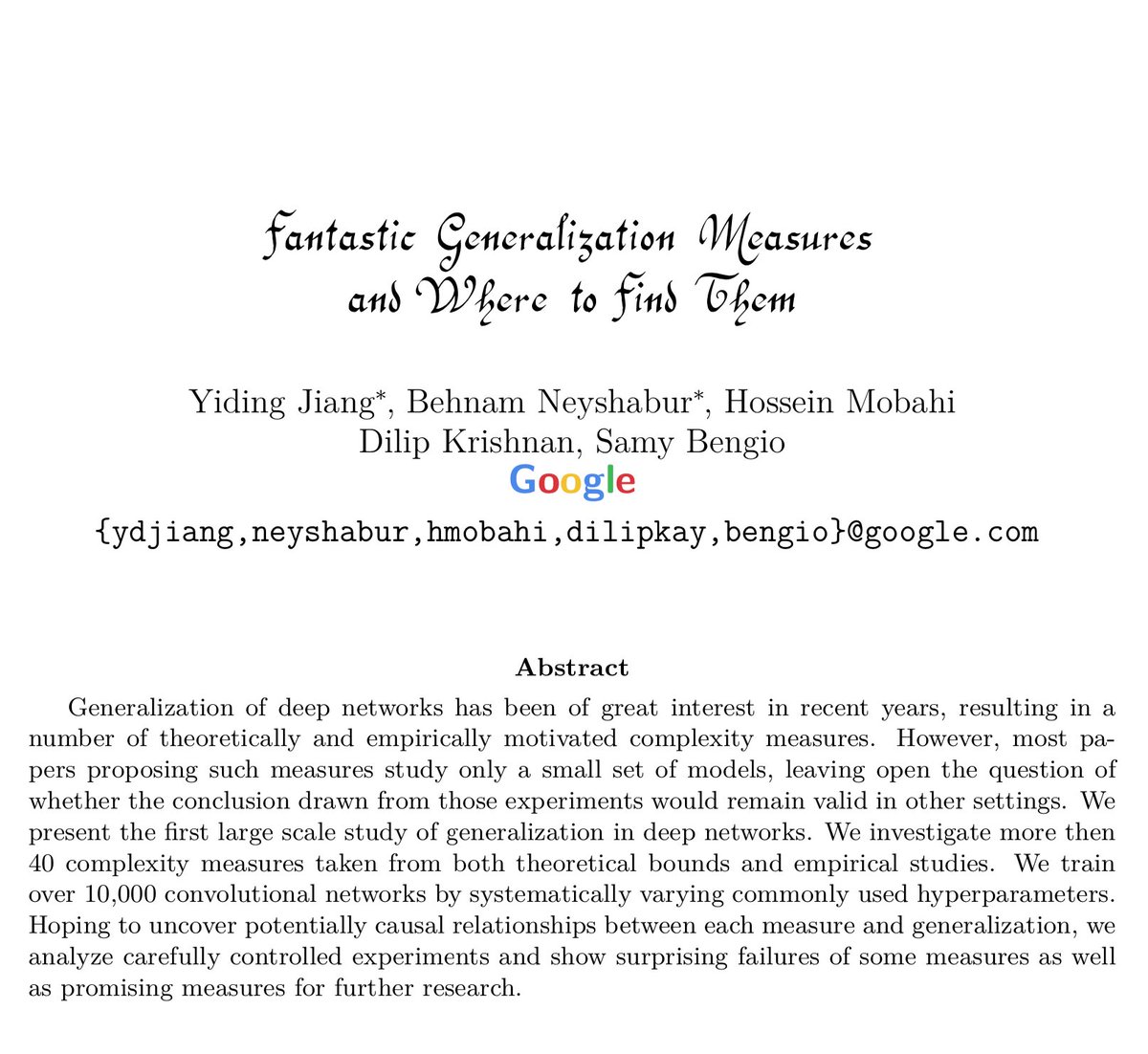 Fantastic Generalization Measures and Where to Find Them “We present the first large scale study of generalization in deep networks. We train over 10,000 convolutional networks by systematically varying commonly used hyperparameters.” https://arxiv.org/abs/1912.02178 https://twitter.com/TheGradient/status/1202404270701600769 …pic.twitter.com/b0FAhjAReX