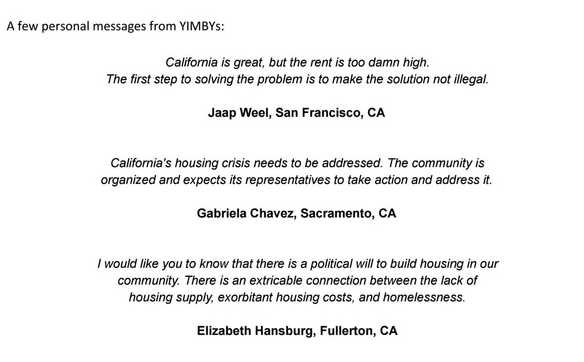 Quotes from YIMBYs in Sacramento, Fullerton, @HousingOC and more:pic.twitter.com/CxxUdEDz5U