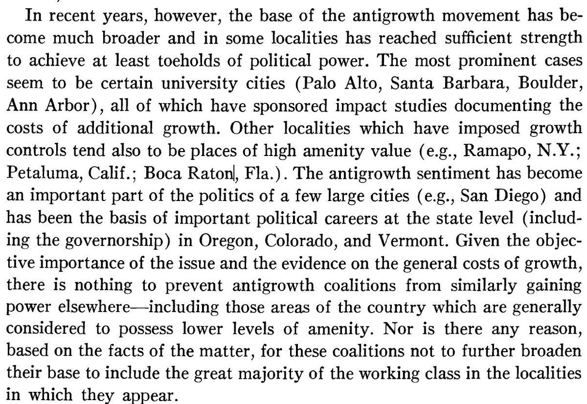 Anti-growth sociologist Harvey Molotch cited Palo Alto, Santa Barbara, Boulder, and Ann Arbor as cities successfully fighting back against growth in 1976. The result: displacement and unaffordability. pic.twitter.com/7hBu4yH9IZ