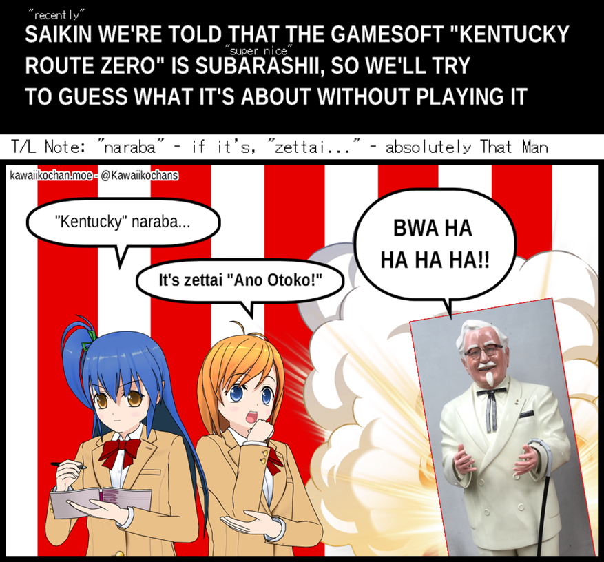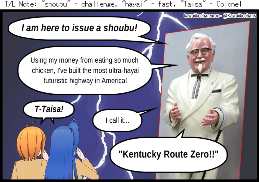 https://kawaiikochan.moe/post/190556994496/saikin-were-told-that-the-gamesoft-kentucky … Hi, it's Kawaiikochans, who've been issued a shoubu by the Taisa?! "Kentucky Route Zero..." it seems like it'll be tough.