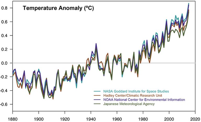 Temperature data from four international science institutions. All show rapid warming in the past few decades