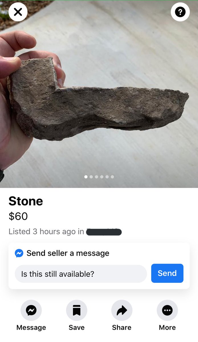 I'm almost certain that's a painted rock shaped corner tile made of cement (used outside homes, buildings, and fireplaces). Not too many people bother cutting them of actual stone (time and cost). Even if it was stone cut like that, 60 dollars is far to expensive for one piece.