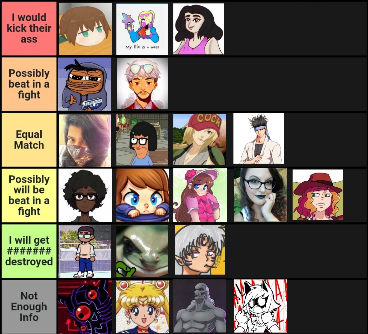 I could probably make 2 or 3 more of these but for now, my first "Mutuals Fight Tier List"!!! If you feel you should be higher or lower, please explain your reasoning o3opic.twitter.com/VJchCzVby9