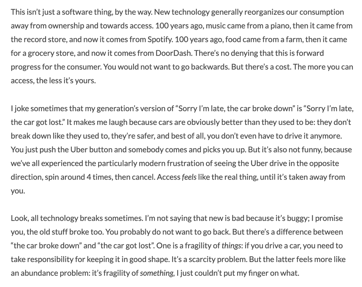 “New technology generally reorganizes our consumption away from ownership and towards access.” “the cost is complexity, outsourced agency, and brittleness. The cost of ownership is up front and visible; the cost of access is back-dated and hidden.”https://twitter.com/Alex_Danco/status/1188233639605260288?s=20 …