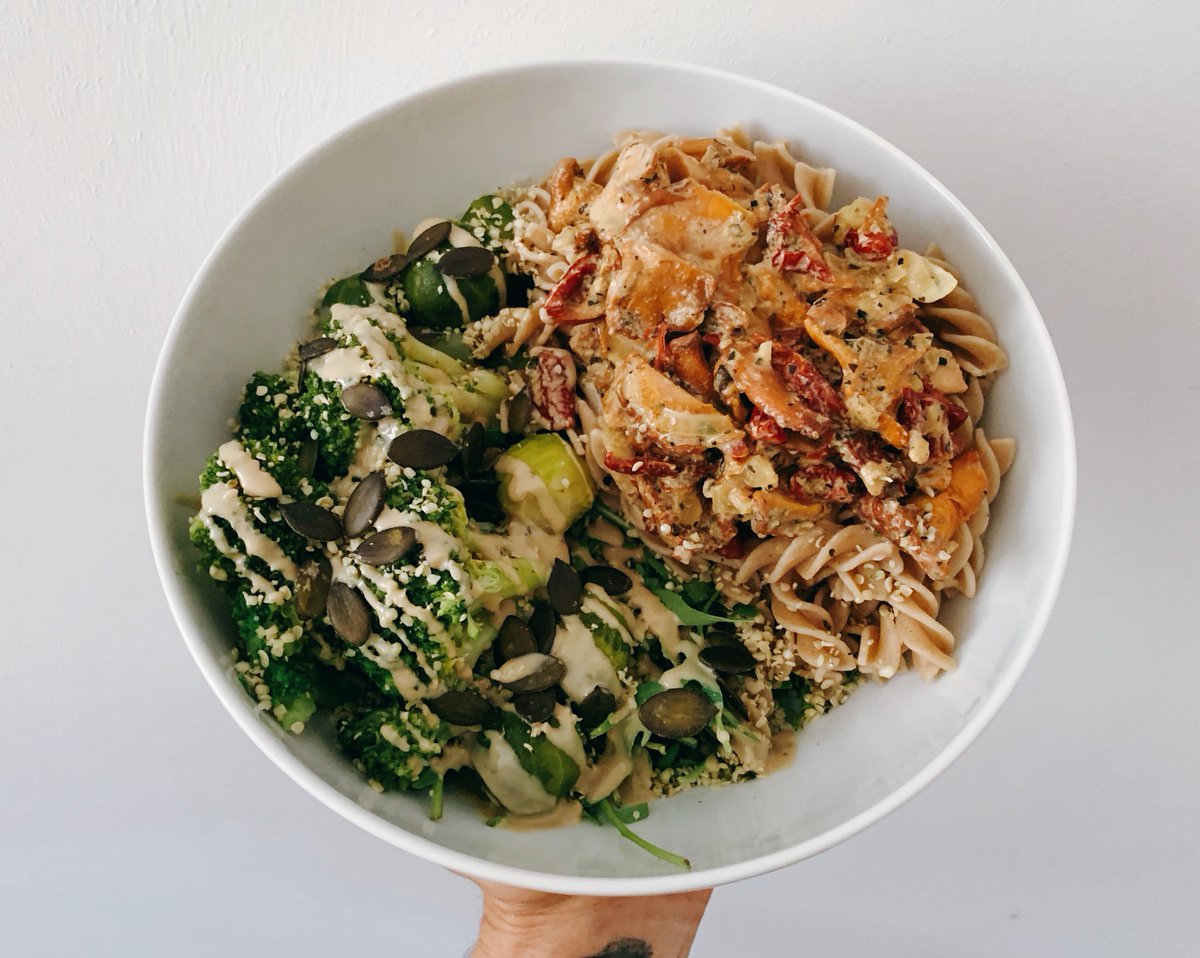 Fusilli with a mushroom dried tomato sauce, on arugula salad with broccoli and sprouts.pic.twitter.com/eYXlckSOWw