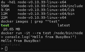 Successfully built a BusyBox docker container with node and npm inside. Total image size: 20.65MB. //cc @yoshuawuytspic.twitter.com/CVexPOVQVP