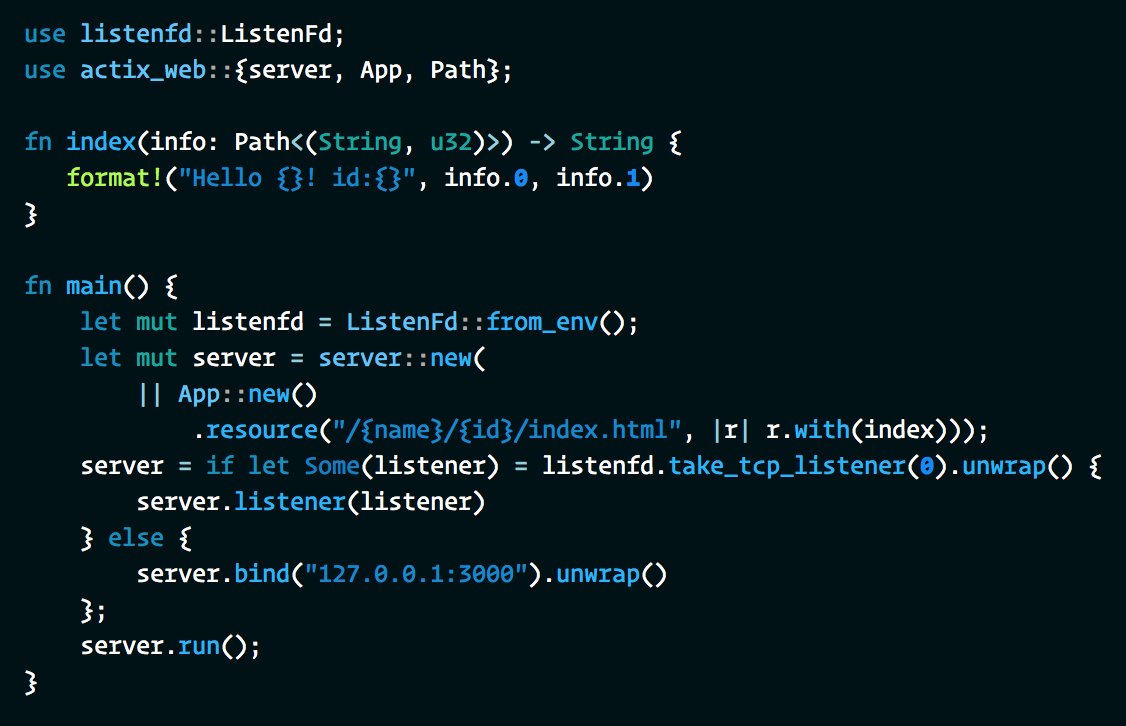 I built something. It's called systemfd and it implements a (modified) version of the systemd socket passing protocol. Paired with cargo-watch and the listenfd crate you can get auto reloading actix dev servers. https://crates.io/crates/systemfd  / https://crates.io/crates/listenfd pic.twitter.com/XvBOC6Dijo