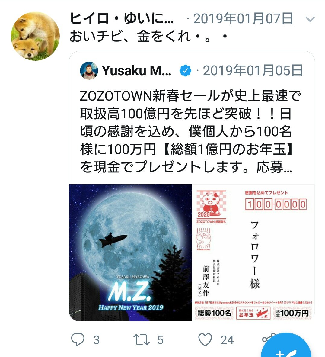 【ルール③】 ・当選者は抽選で決定し、抽選結果のご連絡は当選者のみにDMにて行います。 ・18歳未満の方が当選された場合は、100万円の受け取りに保護者の承諾が必要となります。 ・前澤友作の偽アカウントにご注意ください。アカウント名横の青いオフィシャルマークが本物の証です。