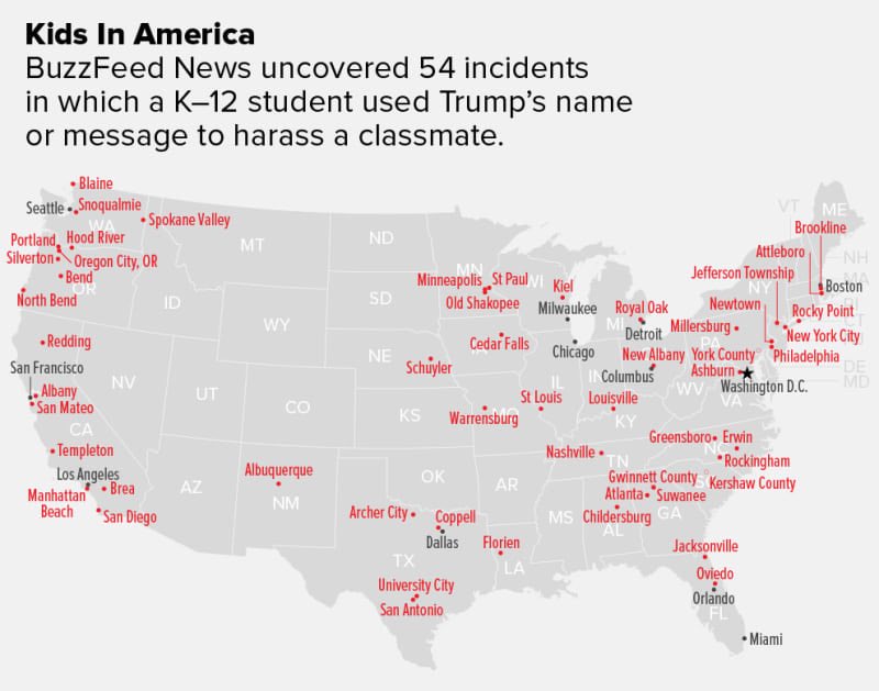 Remarkable. BuzzFeed found 54 incidents of school bullying where students used Trump's words to harass classmates http://bzfd.it/2qZBDZM pic.twitter.com/38GGmThHVM