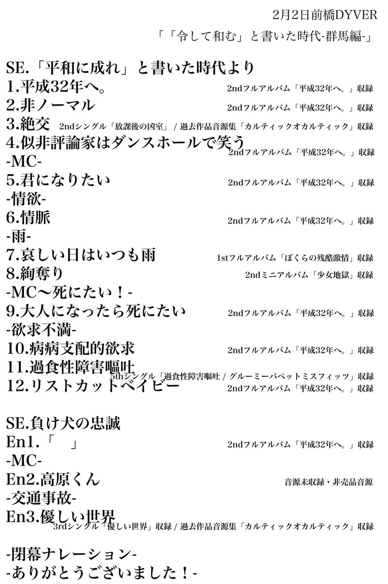2/2 見世物公演概要 次回→2/5 新潟GOLDEN PIGS BLACKSTAGE 遂に始まりました「令して和む」と書いた時代!