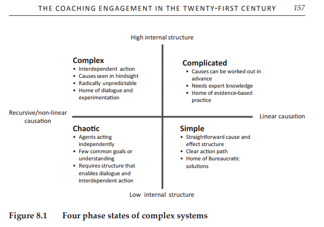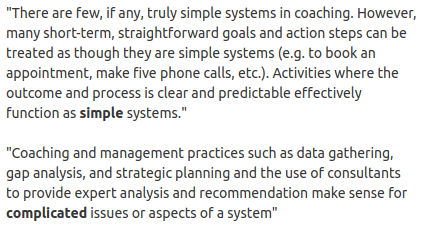 Cavanagh's chapter in Beyond Goals is excellent! Talks about metasystematicity, and what forms of coaching are best suited for simple, complicated, chaotic, and complex states of systems. Also discusses a shift from goal to purpose orientation. https://static1.squarespace.com/static/56f581f83c44d8fc598bccbf/t/570ef3e0a3360c226a32ffde/1460597729733/Cavanagh-2012-The+Coaching+Engagment+in+the+21st+Century+.pdf … 1/
