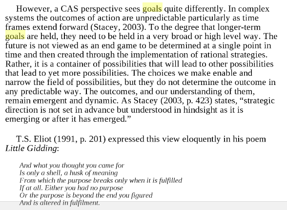 "Typically, goals needs to be co-created among stakeholders and held loosely enough for them to develop and evolve over time. As shall be discussed at length later, the notion of purpose, rather than goals, may be a better organizing concept for coaching in complex settings" 3/