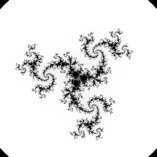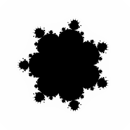 D=8;W=540 p=lambda z,d:0 if z==0j else z**d def setup():size(W,W);loadPixels();[F(i/W,i%W,256,0+0j,0)for i in range(W*W)];updatePixels() def F(u,v,N,z,i): while abs(z**2)<4 and i<N:z=p(z,D)+complex(u*3./W-1.5,v*3./W-1.5);i+=1;pixels[u+v*W]=color(256-256*i/N) #つぶやきProcessingpic.twitter.com/K5afCyptBv