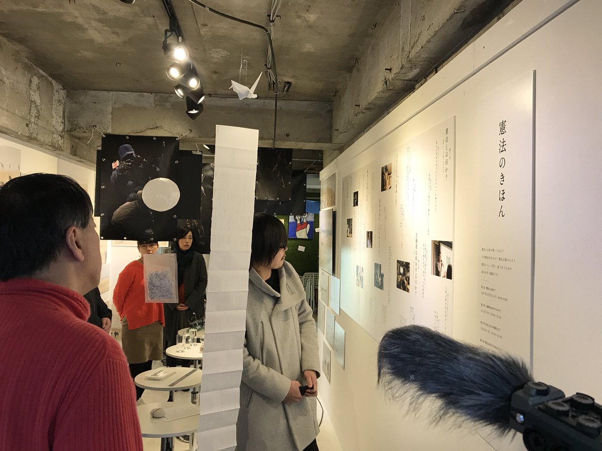 新芸術校グループC、完全なる仮説展、講評会、現在生放送中です。まずは三上さんの憲法を扱った作品。憲法をコンパクトにまとめた冊子はグッドデザイン賞を受賞。今回は質量をテーマにインスタレーションに展開。ゲスト講師は宮台真司さんです。
