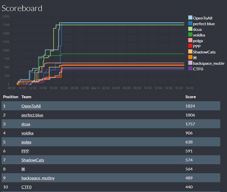 Here's the final scoreboard of the CTF. Congrats and thanks for participating!pic.twitter.com/Lpb4Su7Hay