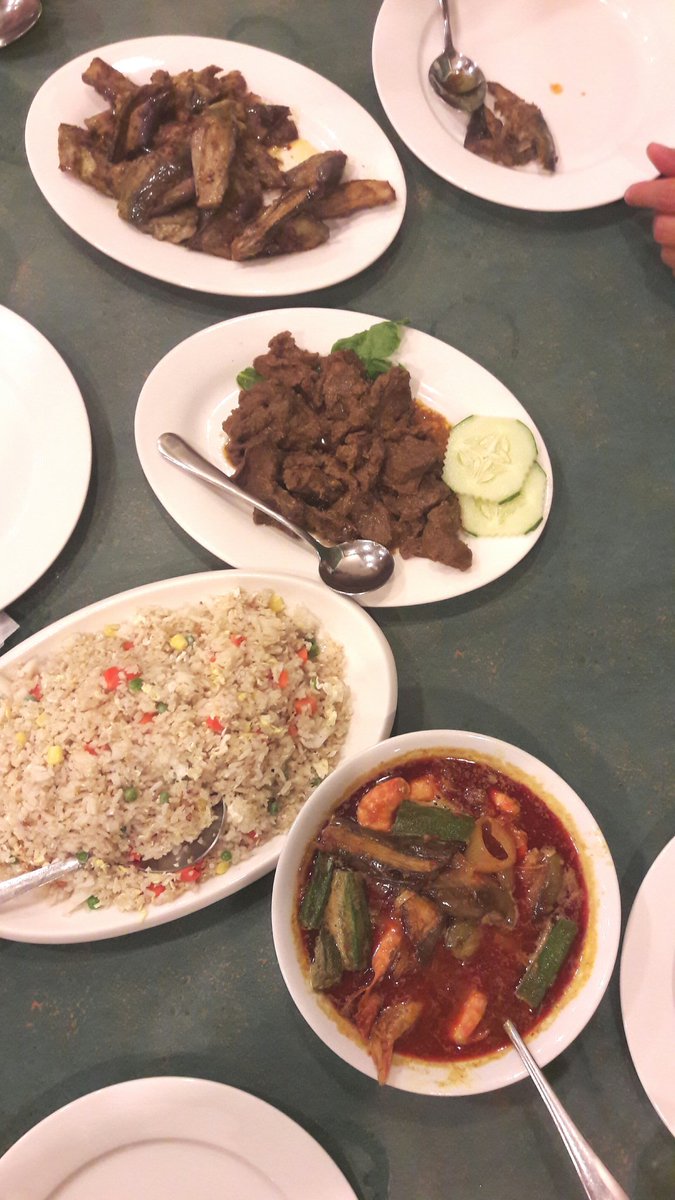 Malaysian shrimp paste eggplant, beef rendang, assam prawns, fried rice.