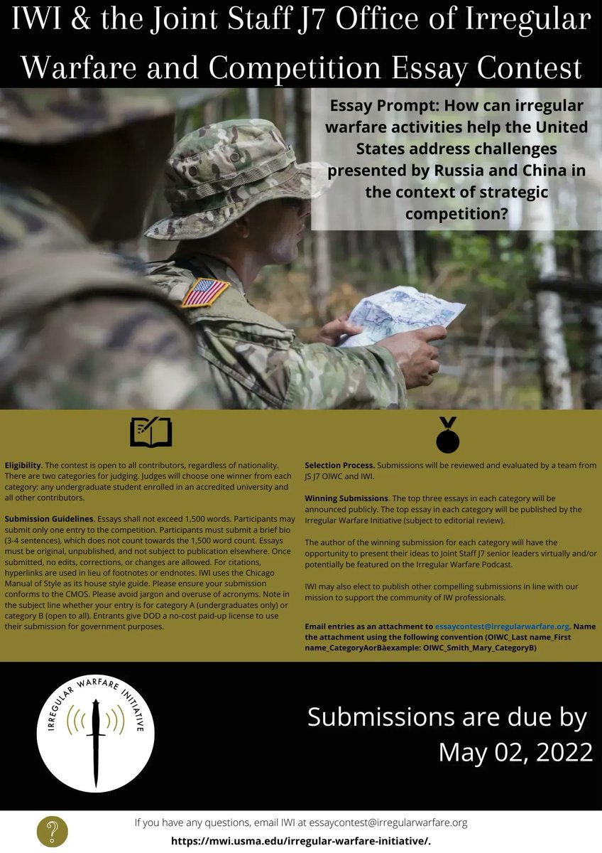@thejointstaff J7 Office of Irregular Warfare and Competition are pleased to announce an essay contest to foster interest in and generate new ideas about the future of IW and competition. See more information below.