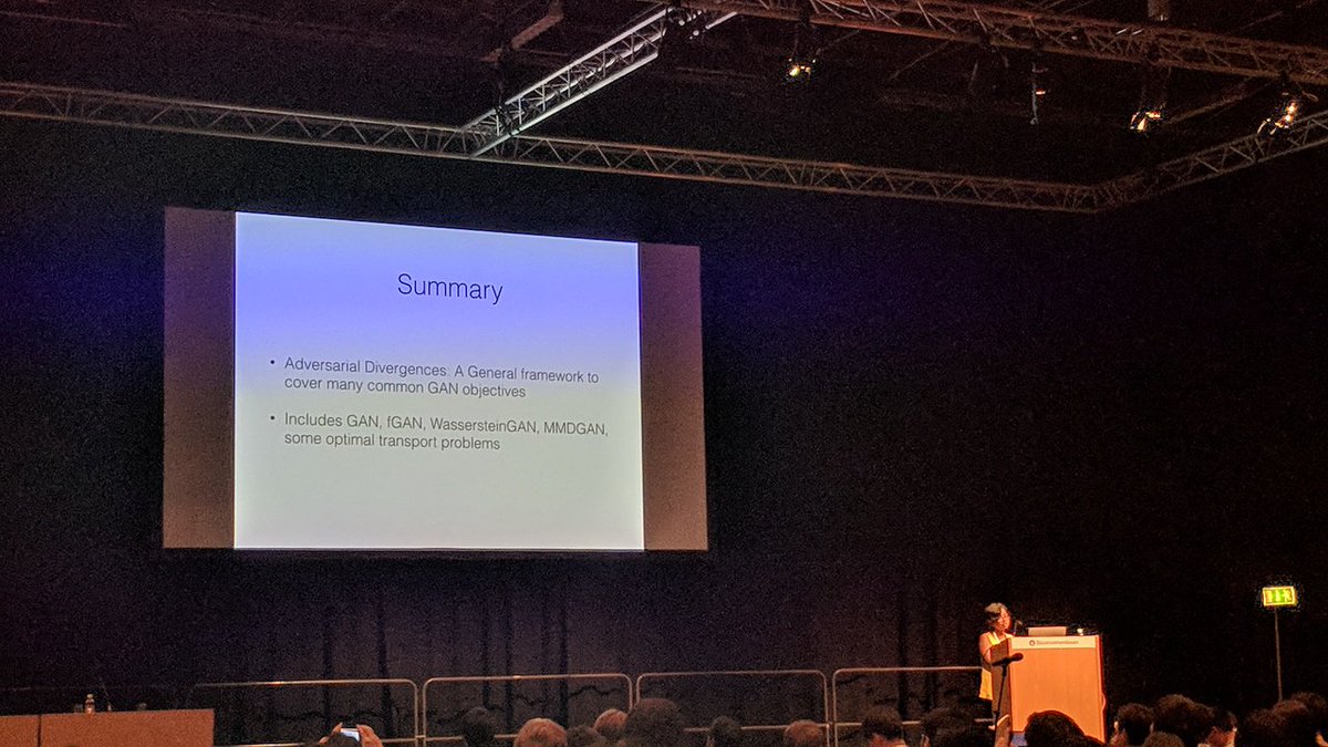 @kamalikac presents her recent influential work on adversarial divergences at#icml2018 see http://papers.nips.cc/paper/7138-approximation-and-convergence-properties-of-generative-adversarial-learning.pdf … and follow-up papers.pic.twitter.com/mWhjjgojTA