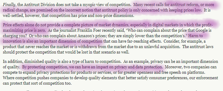 This jumps out from the U.S. antitrust chief's speech today. Shoots down the notion that low consumer prices shield Big Tech cos from antitrust action. https://www.wsj.com/articles/doj-antitrust-chief-stresses-role-of-competition-in-digital-economy-11560269903?shareToken=st47f0e3de6a184262b3696e97d56947c0 … pic.twitter.com/SbxU6o8lYp