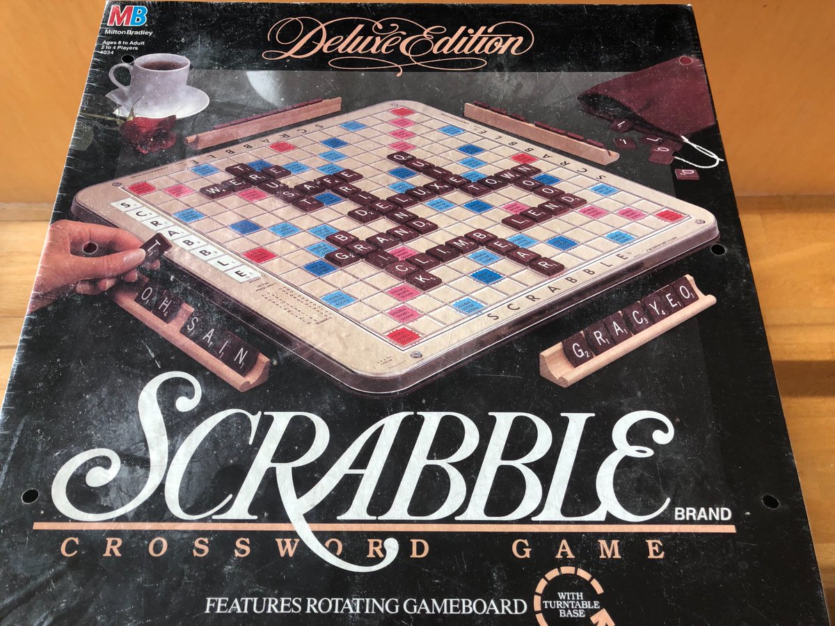 Turns out that peak Scrabble was the 1989 Deluxe edition - recessed grid to keep hardwood tiles in place and a rotating gameboard, made in USA...one of the few things from the 80s worth buying. Brand new, still wrapped in plastic. Sometimes - rarely - eBay > Amazon.pic.twitter.com/zodi2wX5xm