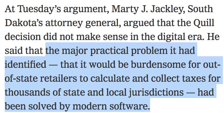 That's a stretch. Yes, there is modern software that does this. No, the problem isn't "solved." Compliance is extraordinarily complicated and costly. [PS - good summary of the Supreme Court case about sales tax for online purchases.] https://www.nytimes.com/2018/04/17/business/justices-divided-on-sales-taxes-for-online-purchases.html …pic.twitter.com/c7QVIpxo9Z
