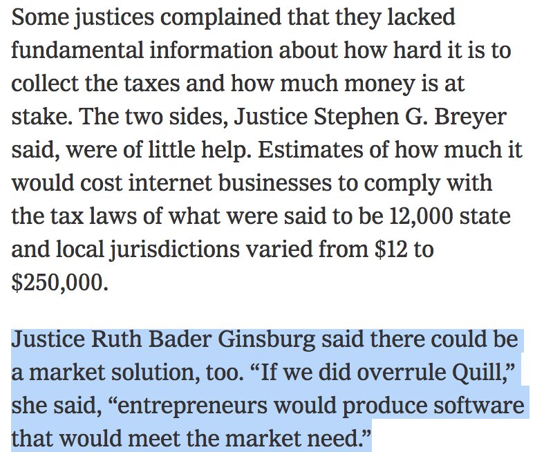 Broken window fallacy 2.0: RGB's idea of a "market solution" to sales tax - force small, out-of-state online businesses to comply w/12k sales tax jurisdictions, let "entrepreneurs...produce software that would meet the market need" for compliance. Facepalm.pic.twitter.com/L9s0fXrmwJ