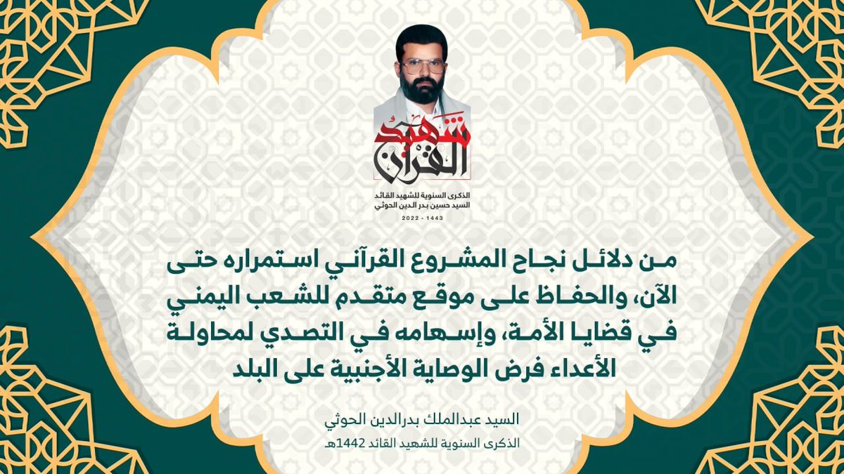 من دلائل نجاح المشروع القرآني استمراره حتى الآن، والحفاظ على موقع متقدم للشعب اليمني في قضايا الأمة، وإسهامه في التصدي لمحاولة الأعداء فرض الوصاية الأجنبية على البلد السيد عبدالملك بدرالدين الحوثي