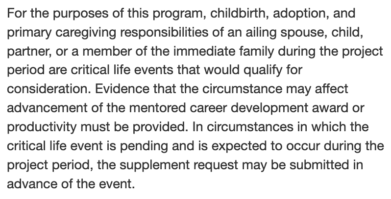 **Share widely!** NIH administrative supplement for K awards, up to $50k, intended to help sustain careers through life events that impact productivity (e.g. childbirth, sick family members). Important move to promote retention of diverse scientists. https://grants.nih.gov/grants/guide/notice-files/NOT-OD-20-054.html …pic.twitter.com/wzV1ecVG2u