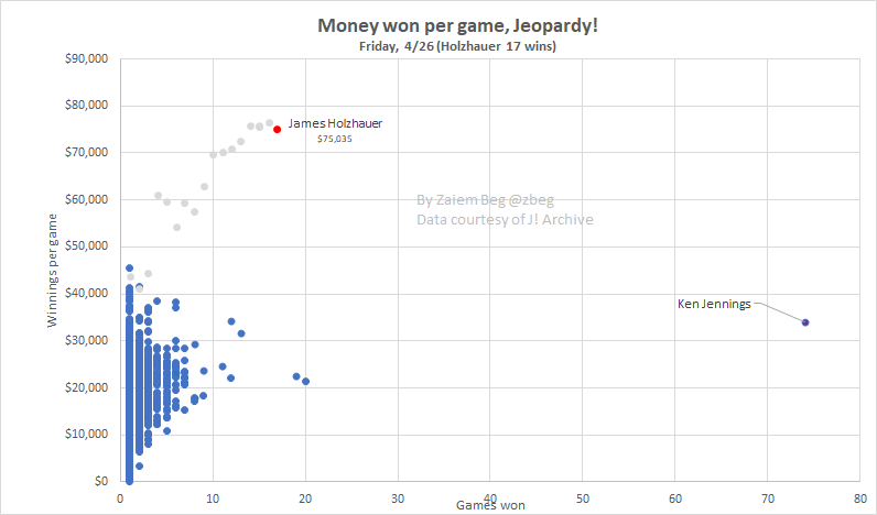 At his current rate, Holzhauer will win more in 33 games than what Ken Jennings won in 74. (2/4)pic.twitter.com/tVZ4xd9HxZ