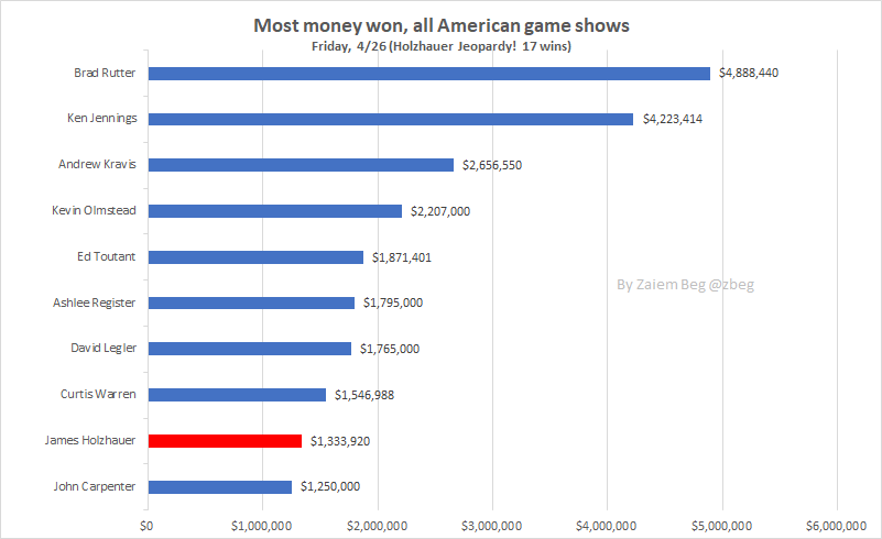 For all American game shows, Holzhauer debuted yesterday at 10 and has moved into 9th. (He also won $58,333 on a show called The Chase.) (4/4)pic.twitter.com/JEMEyUwNUa