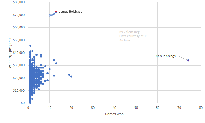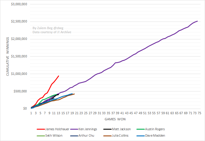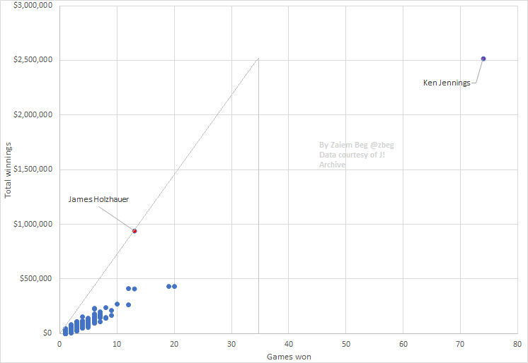 Holzhauer's 13 wins tie him for 4th with Matt Jackson. His winnings of $942,738 are only behind @KenJennings $2,520,700. At Holzhauer's current winrate, he will catch Jennings after win 36.pic.twitter.com/ctIGvsgFkL