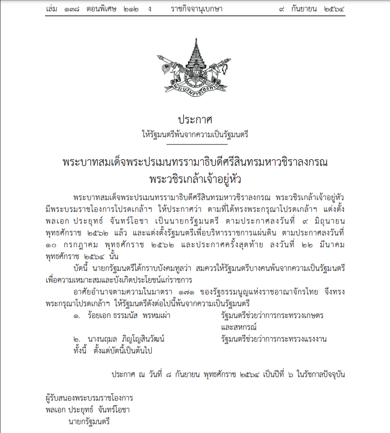RESIGNED... OR FIRED? Assistant Agriculture Minister Thammanat Prompao said earlier today he resigned from the Cabinet. But the official announcement published on the Royal Government Gazette suggested he was fired, along with deputy labour minister Narumon Pinyosinwat.pic.twitter.com/ncsFtkjiX0