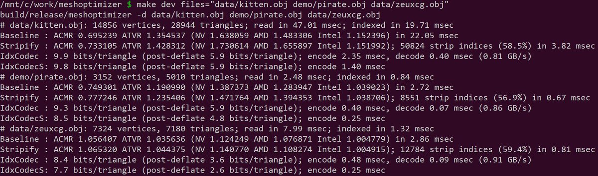 Finished a working version of triangle strip index encoder; it's more interesting than I thought it might be, but not fundamentally so. Overall you lose a bit in ACMR, win a bit less than half of index buffer space, and can win up to a bit/triangle for encoded indices...pic.twitter.com/PtOu0aQbcL