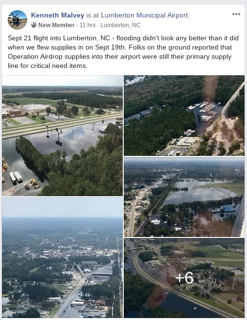 For context, see this from a pilot who flew today to Lumberton, NC. It's a poor town, prone to frequent floods. Pilots said he was told that "Operation Airdrop supplies into their airport were still their primary supply line for critical need items." https://www.facebook.com/groups/319817688781393/permalink/322986058464556/ …pic.twitter.com/ok3nPJrlBZ