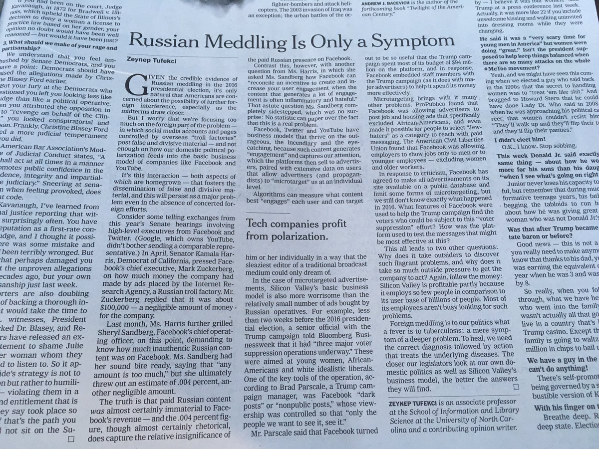 Foreign meddling is real but it's a symptom not the actual illness: our domestic polarization and how our public sphere operates. We're looking for ibuprofen to cure an infection. For a solution, focus less on less Russia, more on the US. My NYT piece: https://www.nytimes.com/2018/10/03/opinion/midterms-facebook-foreign-meddling.html …pic.twitter.com/yYqDuJl1M9