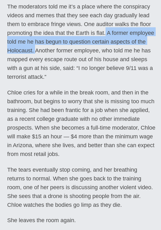 Meanwhile, these contractors watch people murdered and worse all day for $15 an hour (people who work at Facebook make about quarter of a million on average, iirc) and some of them have begun to buy into the conspiracies they are subjected to all day. Great way to run a company.pic.twitter.com/tO3J3ZLmmV