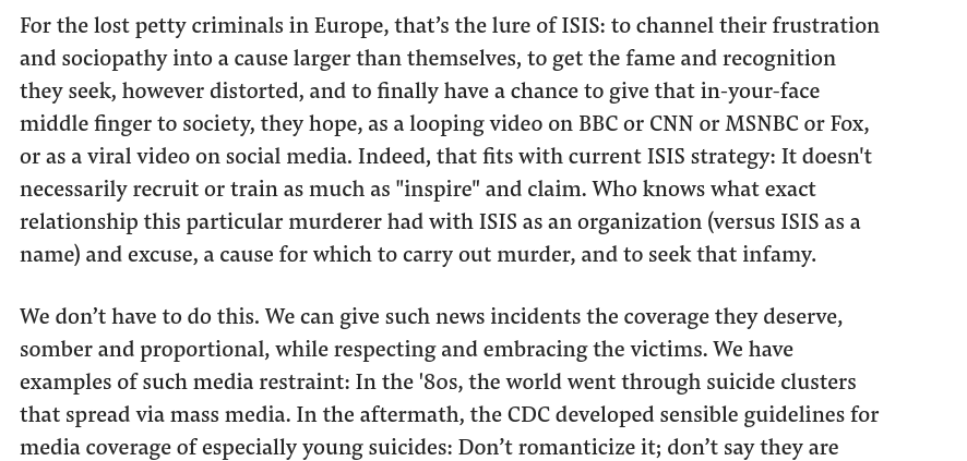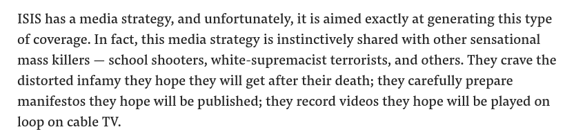 Adding one more article of mine from 2017 on ISIS. I concluded "Terrorism is mass murder with a media strategy; it’s long past time to disrupt it." This applies to NZ: using virality and mass media insticts to recruit. It *is* long past time to disrupt it. https://www.buzzfeednews.com/article/zeyneptufekci/dont-let-isis-shape-the-news …pic.twitter.com/lHeLkaCXF2